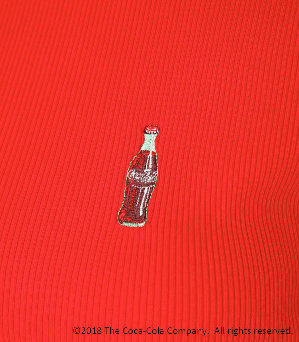 胸に刺繍された大きめなCOCA-COLAのボトルビンがポイントのテレコTシャツ。