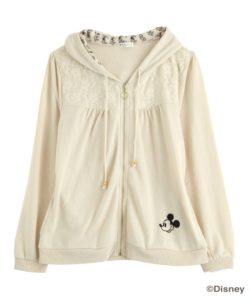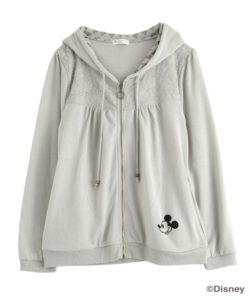 フードの中に線画のキュートなミッキーマウスが並び、カジュアル使いしやすいアイテムです。