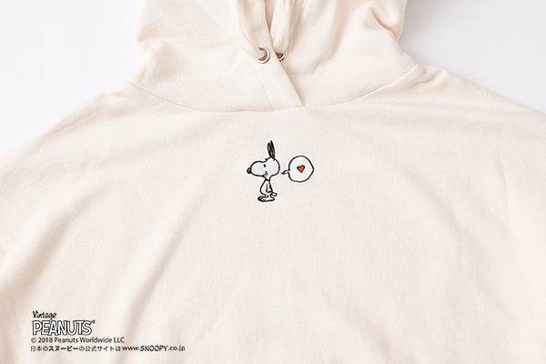 フロントにスヌーピーのキャラクター刺繍がほどこされたオフホワイト、