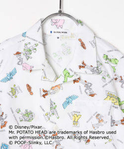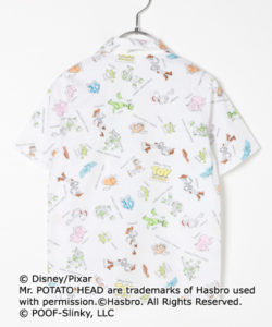 ディズニー/ピクサー映画『トイ・ストーリー』に登場するおもちゃ達の総柄デザインがポップで可愛い開襟シャツ。