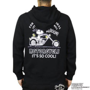 「スヌーピー」と「ウッドストック」がタンデムに乗車しているデザインのプルパーカー。
