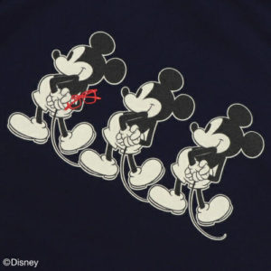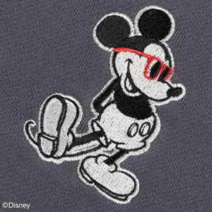 胸もとには刺しゅうで施したメガネスタイルの「ミッキーマウス」が、バックにはメガネ部分のみを刺しゅう仕上げにしたヴィンテージプリントの「ミッキーマウス」が配置されています。