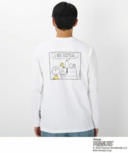 「チャーリー・ブラウン」、「スヌーピー」、「ウッドストック」のゆるさが愛らしいコミックグラフィックがバックにプリントされた長袖Tシャツ。