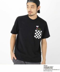 チェッカーフラッグ柄のポケットが印象的な半袖Tシャツには、サングラスをかけた「スヌーピー」と「ウッドストック」たちのグラフィックが刺しゅうされています。