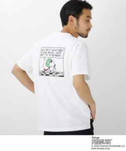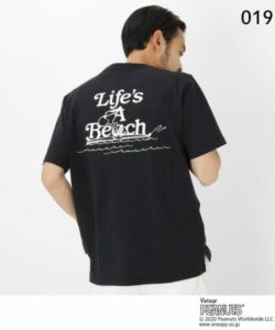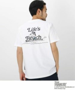 抜け感のあるサーフスタイルの「スヌーピー」に動きのあるフォントグラフィックがマッチしたバックプリントがおしゃれなポケットTシャツ。