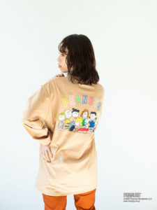 「スヌーピー」と仲間たちのバックプリントが目を惹くクルーネックロングTシャツ。