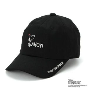 スヌーピーの刺繍が施された、ラフなシルエットのローキャップ。